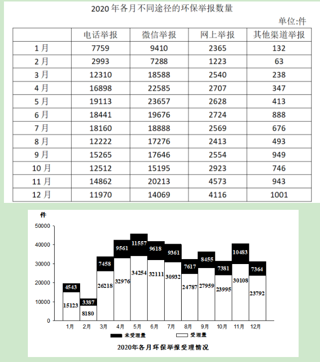 2020年12月,全國(guó)“12369環(huán)保舉報(bào)聯(lián)網(wǎng)管理平臺(tái)”共接到環(huán)保舉報(bào)31156件,環(huán)比下降23.2%,同比下降10.3%,其中,受理量23792件,較11月減少6316件;因舉報(bào)線索不詳或不屬于生態(tài)環(huán)境部門職責(zé)范圍而未受理7364件,較11月減少3119件。