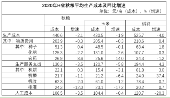 2020年,H省秋糧玉米和稻谷的市場(chǎng)平均交易價(jià)格分別為2.34元/公斤和2.74元/公斤,分別比上年上漲28.6%和8.7%。按此價(jià)格測(cè)算,2020年全省農(nóng)戶種植玉米、稻谷扣除成本前的產(chǎn)值分別為957.1元/畝、1520.7元/畝,分別比上年增長(zhǎng)33.4%、8.9%。