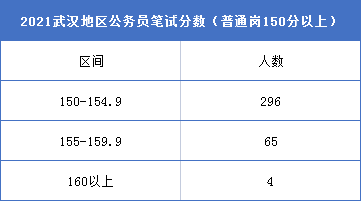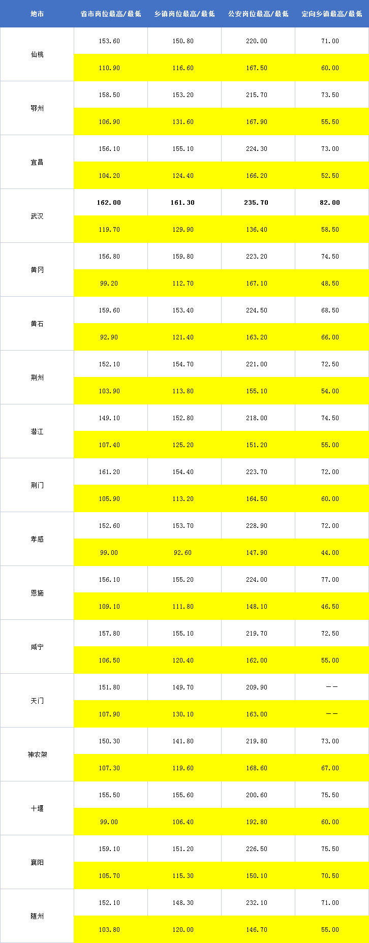 查看2021年進面名單可知,湖北全省進面最高分為160分,招錄單位江岸區(qū)的武漢市江岸區(qū)財政局,政策研究崗(14230202001046013),行測和申論分數(shù)分別為80、82,進面總分為40.45,該崗位計劃招錄1人。根據(jù)2021年湖北公務員最高/最低進面分可知,鄉(xiāng)鎮(zhèn)崗位最高分為161.3分,公安最高分為235.7分,定向鄉(xiāng)鎮(zhèn)最高分為82分。