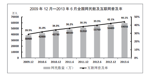 (2)2013年6月,全國互聯(lián)網(wǎng)普及率比2010年6月提高了12.3個百分點