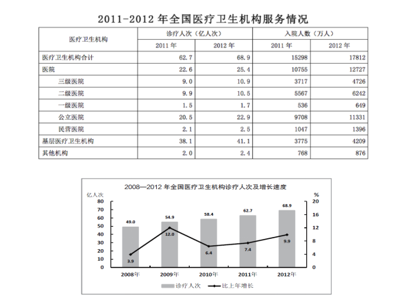 (1)2010-2012年三年,全國醫(yī)療衛(wèi)生機構(gòu)年平均診療人次為63.3萬;