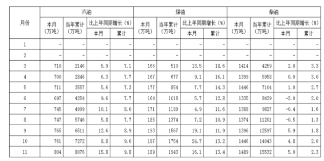 2012年1-11月份我國汽油、煤油、柴油產(chǎn)量完成情況