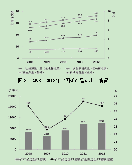圖1 2008—2012年全國(guó)一次能源、石油生產(chǎn)量與消費(fèi)量的情況