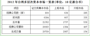 臺灣資本市場第三層次為興柜市場。在準入門檻方面,興柜市場沒有營業(yè)利潤、資本額、設(shè)立年限的限制,只須符合已經(jīng)申報上市或上柜輔導(dǎo)且兩家以上證券商書面推薦。至2012年底,興柜公司285家,資本額0.335兆新臺幣,總市值0.538兆新臺幣。