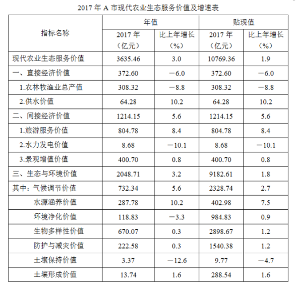 B、2017年A市現(xiàn)代農(nóng)業(yè)生態(tài)服務(wù)價(jià)值年值增長(zhǎng)率、貼現(xiàn)值增長(zhǎng)率最低的是同一個(gè)指標(biāo)