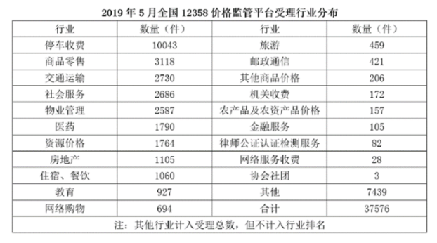 2019年5月,全國(guó)12358價(jià)格監(jiān)管平臺(tái)受理價(jià)格舉報(bào)、投訴、咨詢(xún)共計(jì)37576件,同比下降,環(huán)比下降。其中,價(jià)格舉報(bào)4192件,環(huán)比下降;價(jià)格投訴2059件,環(huán)比下降;價(jià)格咨詢(xún)31325件,環(huán)比下降。平臺(tái)受理量排名前十的省份依次是北京(5786件)、江蘇(3528件)、上海(2499件)、重慶(2486件)、河南(2469件)、陜西(2440件)、浙江(2321件)、天津(1571件)、福建(1483件)、廣西(1309件)。平臺(tái)受理量行業(yè)分布如下表所示: