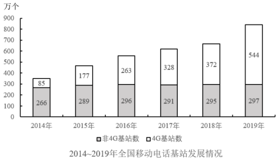 。2014~2019年,全國移動電話4G及非4G基站數(shù)變化情況如下圖所示: