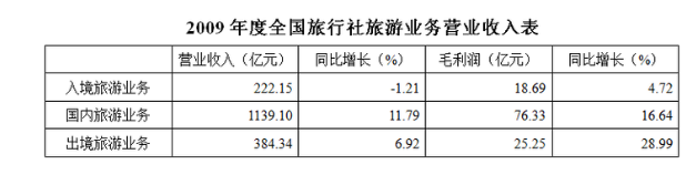 2009年度全國(guó)旅行社的旅游業(yè)務(wù)營(yíng)業(yè)收入為1745.59億元,同比增長(zhǎng)8.87%;旅游業(yè)務(wù)毛利潤(rùn)為120.27億元,旅游業(yè)務(wù)毛利率為6.89%;實(shí)繳稅金為12.69億元,同比增長(zhǎng)12.37%;外匯結(jié)匯10.51億美元,同比減少11.24%;全國(guó)促銷(xiāo)費(fèi)支出為6.76億元,同比增長(zhǎng)13.87%。