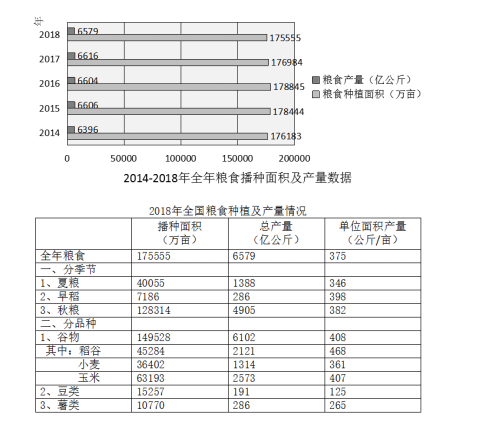 國家統(tǒng)計局公布的全國糧食生產(chǎn)數(shù)據(jù)顯示,2018年全國糧食播種面積175555萬畝,比2017年下降0.8%。全國糧食單位面積產(chǎn)量375公斤/畝,比2017年增長0.2%。谷物單位面積產(chǎn)量408公斤/畝,比2017年增長0.3%。糧食總產(chǎn)量6579億公斤,比2017年下降0.6%;其中谷物(包括稻谷,小麥,玉米、大麥、高粱、蕎麥、燕麥等)總產(chǎn)量6102億公斤,比2017年下降0.8%。全年糧食產(chǎn)量雖有所下降,但減幅不大,仍處于高位水平,屬于豐收年景。