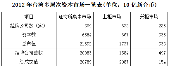 臺(tái)灣資本市場(chǎng)第三層次為興柜市場(chǎng)。在準(zhǔn)入門(mén)檻方面,興柜市場(chǎng)沒(méi)有營(yíng)業(yè)利潤(rùn)、資本額、設(shè)立年限的限制,只須符合已經(jīng)申報(bào)上市或上柜輔導(dǎo)且兩家以上證券商書(shū)面推薦。至2012年底,興柜公司285家,資本額0.335兆新臺(tái)幣,總市值0.538兆新臺(tái)幣。