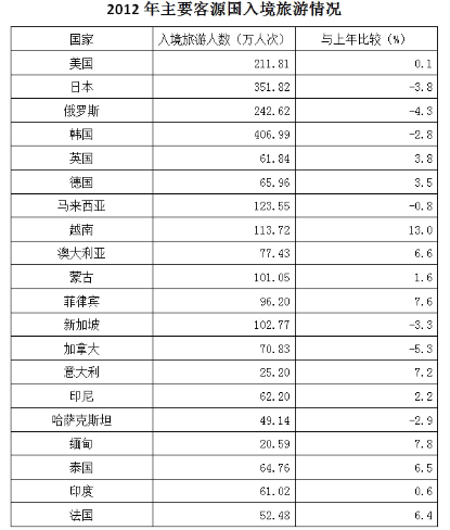 A、2012年,韓國(guó)為我國(guó)第一大入境客源國(guó)