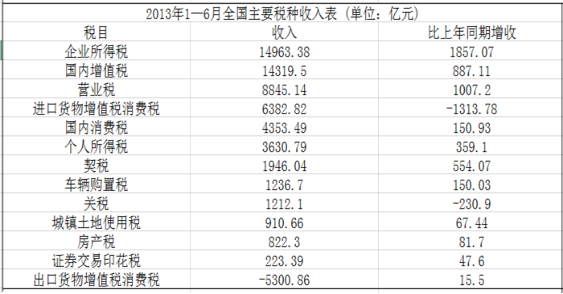 2013年二季度,我國(guó)稅收月收入同比增速逐步提高,分別為7.9%、8.3%和12.9%。截至2013年6月,全國(guó)稅收總收入完成59260.61億元,同比增長(zhǎng)7.9%,較上年同期回落1.9個(gè)百分點(diǎn)。其中,國(guó)內(nèi)增值稅、企業(yè)所得稅同比分別增長(zhǎng)6.6%和14.2%,較上年同期增速分別回落1.5和3.1個(gè)百分點(diǎn);房產(chǎn)稅同比增長(zhǎng)11%,比上年同期增速回落19.1個(gè)百分點(diǎn);進(jìn)口貨物增值稅、消費(fèi)稅和關(guān)稅同比分別下降17.1%和16%,比上年同期增速分別回落24.5和22.9個(gè)百分點(diǎn)。