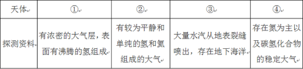 13.“旅行者1號(hào)”空間探測(cè)器經(jīng)過(guò)36年的人類(lèi)星際探索,沿途探索①木星②土星③土衛(wèi)二④土衛(wèi)六是否存在生命跡象,并發(fā)回資料。閱讀表格,依據(jù)探測(cè)資料判斷將來(lái)最有可能孕育生命的天體是( )
