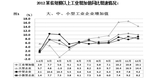 2012年,某省規(guī)模以上工業(yè)增加值10875億元,比上年增長(zhǎng)7.1%,月度增速?gòu)?-2月的2.9%回升到10-12月的10%以上,大型、中型和小微型企業(yè)增加值分別為3074、3217和4584億元,比上年分別增長(zhǎng)8.2%、6.8%和6.7%。