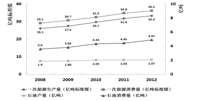 圖1 2008—2012年全國(guó)一次能源、石油生產(chǎn)量與消費(fèi)量的情況
