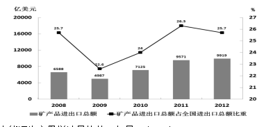 圖2 2008—2012年全國(guó)礦產(chǎn)品進(jìn)出口情況