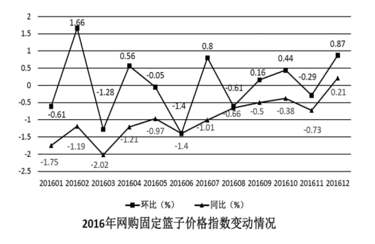 A、2016年,網(wǎng)購固定籃子價(jià)格指數(shù)曾連續(xù)3個(gè)月環(huán)比負(fù)增長