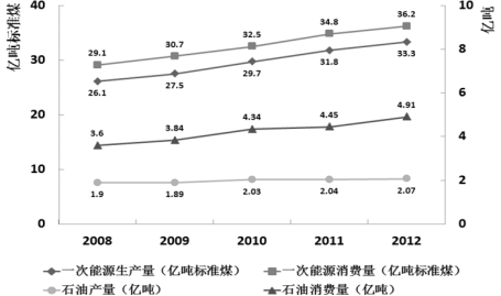圖1 2008—2012年全國(guó)一次能源、石油生產(chǎn)量與消費(fèi)量的情況