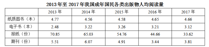 D. 2017年我國(guó)成年國(guó)民人均每天閱讀紙質(zhì)圖書(shū)時(shí)長(zhǎng)低于閱讀報(bào)紙與閱讀期刊時(shí)長(zhǎng)之和