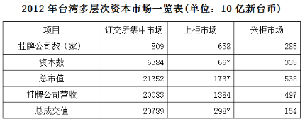 臺(tái)灣資本市場(chǎng)第三層次為興柜市場(chǎng)。在準(zhǔn)入門檻方面,興柜市場(chǎng)沒有營(yíng)業(yè)利潤(rùn)、資本額、設(shè)立年限的限制,只須符合已經(jīng)申報(bào)上市或上柜輔導(dǎo)且兩家以上證券商書面推薦。至2012年底,興柜公司285家,資本額0.335兆新臺(tái)幣,總市值0.538兆新臺(tái)幣。