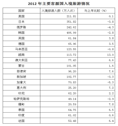 A、2012年,韓國(guó)為我國(guó)第一大入境客源國(guó)