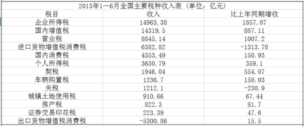 2013年二季度,我國(guó)稅收月收入同比增速逐步提高,分別為7.9%、8.3%和12.9%。截至2013年6月,全國(guó)稅收總收入完成59260.61億元,同比增長(zhǎng)7.9%,較上年同期回落1.9個(gè)百分點(diǎn)。其中,國(guó)內(nèi)增值稅、企業(yè)所得稅同比分別增長(zhǎng)6.6%和14.2%,較上年同期增速分別回落1.5和3.1個(gè)百分點(diǎn);房產(chǎn)稅同比增長(zhǎng)11%,比上年同期增速回落19.1個(gè)百分點(diǎn);進(jìn)口貨物增值稅、消費(fèi)稅和關(guān)稅同比分別下降17.1%和16%,比上年同期增速分別回落24.5和22.9個(gè)百分點(diǎn)。