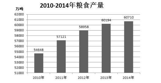 2014年糧食再獲豐收,今年糧食種植面積11274萬公頃,比上年增加78萬公頃,全年糧食產(chǎn)量為60710萬噸,其中夏糧產(chǎn)量13660萬噸,增產(chǎn)3.6%,早稻產(chǎn)量3401萬噸,減產(chǎn)0.4%,秋糧產(chǎn)量43649萬噸,增產(chǎn)0.1%,全年谷物產(chǎn)量55727萬噸,比上年增產(chǎn)0.8%,其中,稻谷產(chǎn)量20634萬噸,增產(chǎn)1.4%,小麥產(chǎn)量12617萬噸,增產(chǎn)3.5%,玉米產(chǎn)量21567萬噸,減產(chǎn)1.3%。