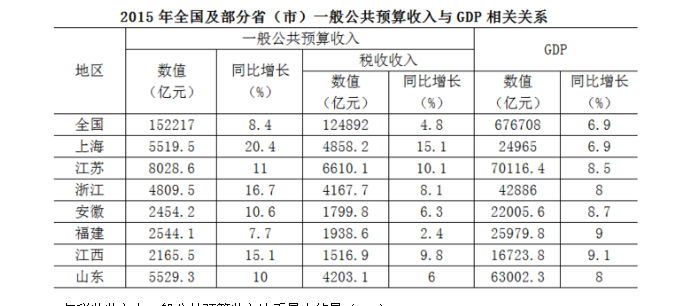 D、2015年全國一般公共預(yù)算收入占GDP的比重較2014年有所減少