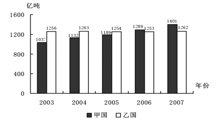 113.2003年~2007年,甲國平均每年比乙國少排放的碳總量為:( )