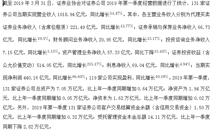 100.關(guān)于證券公司2019年第一季度經(jīng)營數(shù)據(jù),下列說法正確的是( )