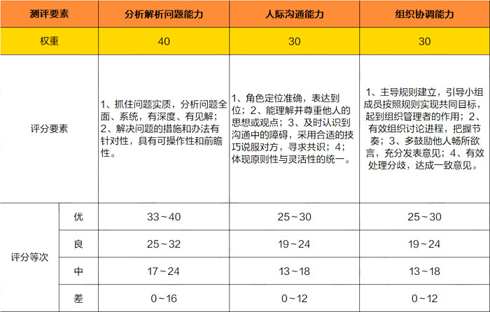 廣東省考目前已經(jīng)進(jìn)入全面?zhèn)淇济嬖囯A段,近幾年常以無領(lǐng)導(dǎo)小組討論的面試形式,所以我們今天主要討論一下無領(lǐng)導(dǎo)小組面試的評分標(biāo)準(zhǔn)。無領(lǐng)導(dǎo)主要考察考生的各方面能力,和結(jié)構(gòu)化面試完全不同,它不是激烈的辯論,而是意見的交流討論;不是用氣勢壓人,而是用氣度服人;不是獨(dú)占鰲頭,而是群策群力引導(dǎo)指引。在這個(gè)基礎(chǔ)上,我們必須進(jìn)行準(zhǔn)備,才能有的放矢。