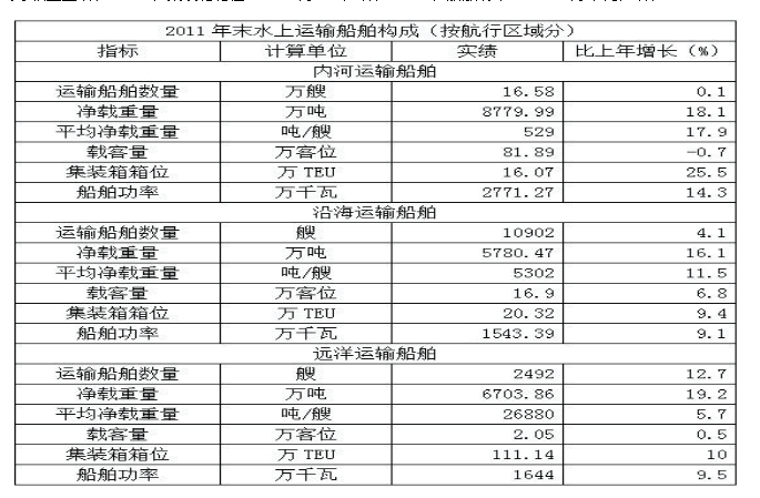2011年底,全國擁有水上運輸船舶17.92萬艘,比上年末增長0.5%;凈載重量21264.32萬噸,增長17.9%;平均凈載重量增長17.3%;集裝箱箱位147.52萬TEU,增長11.4%;船舶功率5949.66萬千瓦,增長11.6%。