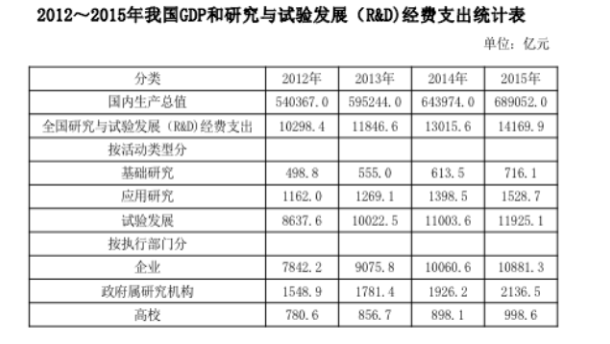 C、2015年,企業(yè)的研究與試驗(yàn)發(fā)展經(jīng)費(fèi)比政府屬研究機(jī)構(gòu)高5倍多