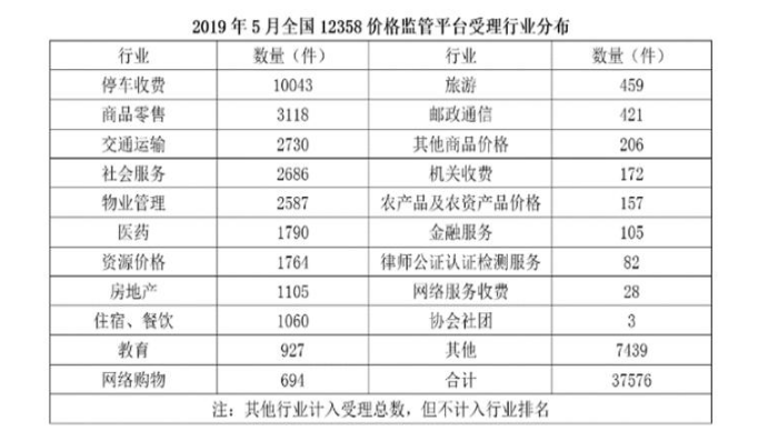 2019年5?,全國12358價(jià)格監(jiān)管平臺受理價(jià)格舉報(bào)、投訴、咨詢共計(jì)37576件,同?下降40.70%,環(huán)?下降9.31%。其中,價(jià)格舉報(bào)4192件,環(huán)?下降19.06%;價(jià)格投訴2059件,環(huán)?下降15.92%;價(jià)格咨詢31325件,環(huán)?下降7.34%。平臺受理量排名前?的省份依次是北京(5786件)、江蘇(3528件)、上海(2499件)、重慶(2486件)、河南(2469件)、陜西(2440件)、浙江(2321件)、天津(1571件)、福建(1483件)、?西(1309件)。平臺受理量?業(yè)分布如下表所?: