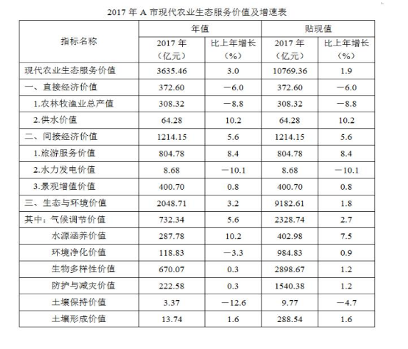 B.2017年A市現(xiàn)代農(nóng)業(yè)生態(tài)服務(wù)價(jià)值年值增長率、貼現(xiàn)值增長率最低的是同一個(gè)指標(biāo)