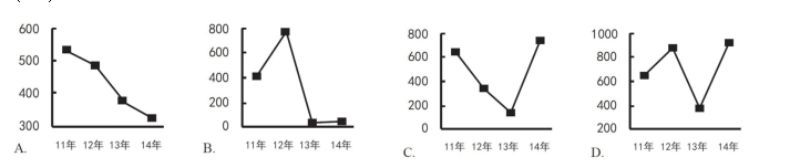 119.以下哪項的折線圖可以準確表現(xiàn)2011~2014年間,我國會展業(yè)總產(chǎn)值同比增量的變化情況(單位:億元)?( )