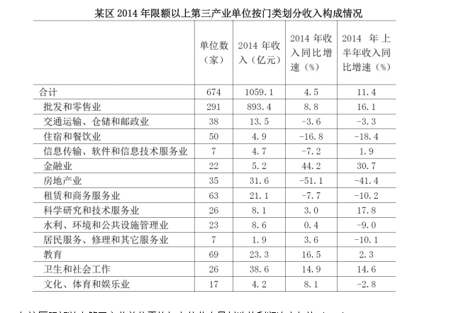 2014年某區(qū)限額以上第三產(chǎn)業(yè)單位共674家,實際收入1059.1億元,同比增長4.5%;實現(xiàn)利潤總額13.5億元,同比增長11.9%;從業(yè)人員達到58631人,同比下降4.3%。