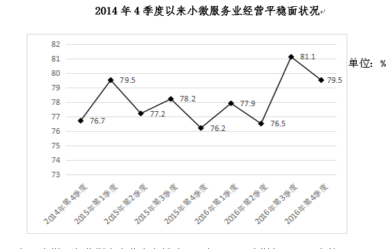 2016年,該省小微服務業(yè)樣本企業(yè)實現(xiàn)營業(yè)收入80.1億元,同比增長15.4%,高于規(guī)模以上重點服務業(yè)企業(yè)8.2個百分點,增速比上年回落0.6個百分點。經(jīng)營平穩(wěn)面擴大,2016年4季度,79.5%的企業(yè)認為本企業(yè)綜合經(jīng)營狀況良好或穩(wěn)定,同比提高3.3個百分點,處于歷史較高水平。