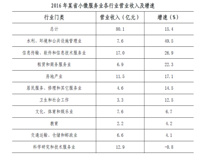 2016年,某省小微服務業(yè)呈現(xiàn)出經(jīng)營平穩(wěn)面、資產規(guī)模、享受稅收優(yōu)惠政策范圍“三擴大”的特點,主要行業(yè)實現(xiàn)較快增長。