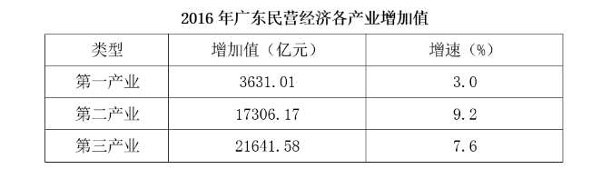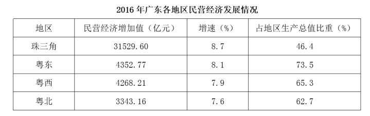 2016年,廣東民營經(jīng)濟增加值突破四萬億元。經(jīng)初步核算,全年實現(xiàn)民營經(jīng)濟增加值42578.76億元,按可比價計算,比上年同期增長7.8%,增幅高于同期GDP增幅0.3個百分點,其中第二產業(yè)增幅比同期GDP第二產業(yè)增幅高3個百分點。民營經(jīng)濟占GDP的比重為53.6%,比2010年提高3.9個百分點,占比逐年提高;對GDP增長的貢獻率為55.5%,同比提高1.3個百分點,拉動GDP增速達4.2個百分點,民營經(jīng)濟的作用不斷提升,是廣東經(jīng)濟增長的主力軍。