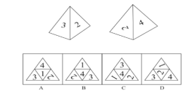 31、如圖所示是從兩個(gè)不同角度觀察到的同一個(gè)正四面體的外表面,將該四面體展開,可能得到的圖形是( )。