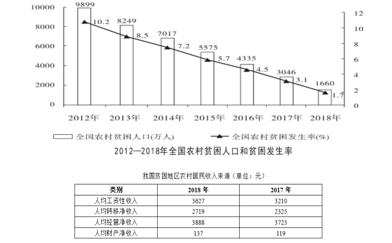 黨的十八大以來,脫貧工作取得巨大成效,全國農(nóng)村貧困人口大幅減少。截至2018年末,全國農(nóng)村貧困人口從2012年末的9899萬人減少至1660萬人;農(nóng)村貧困發(fā)生率從2012年的10.2%下降至1.7%,累計(jì)下降8.5個(gè)百分點(diǎn)。