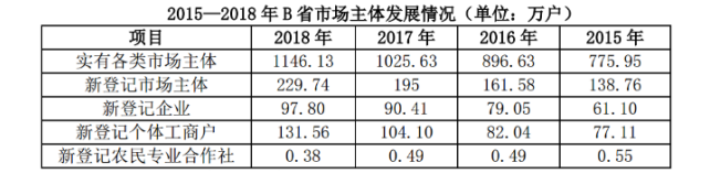 近年來,B省營商環(huán)境不斷優(yōu)化,市場活力不斷增強(qiáng),新登記市場主體保持較快增長勢(shì)頭。2018年,全省新登記市場主體229.74萬戶,日均新登記市場主體6294萬戶,同比增長17.82%。