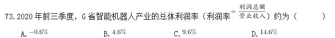 74.2020年前三季度,G省工業(yè)機(jī)器人制造業(yè)營(yíng)業(yè)收入同比增長(zhǎng)約( )億元。