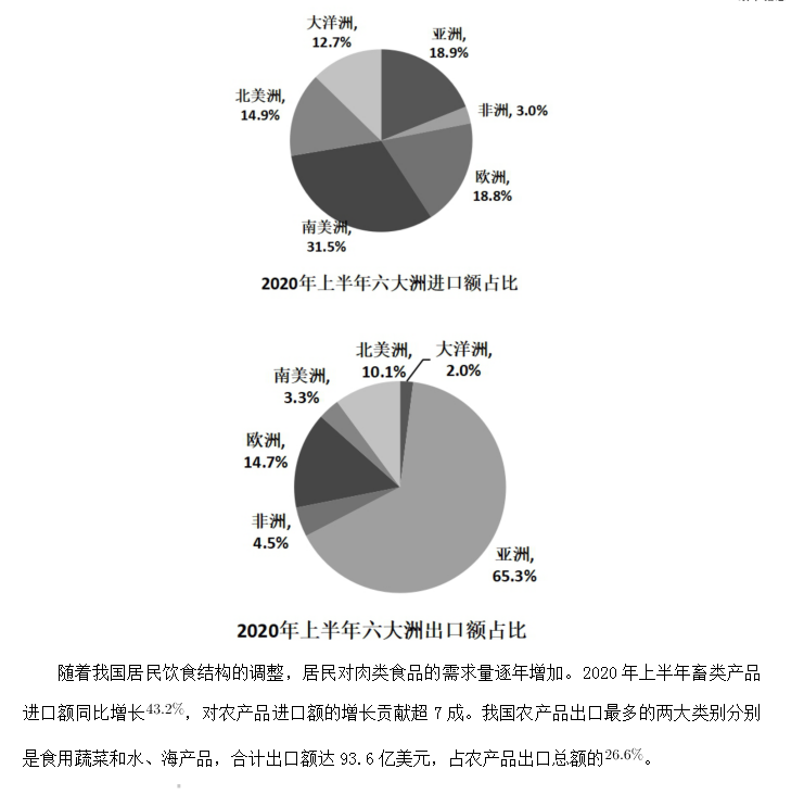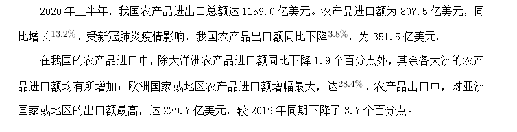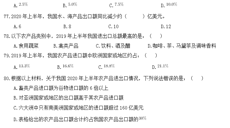 76.2020年上半年,我國(guó)農(nóng)產(chǎn)品進(jìn)出口額同比增長(zhǎng)約:( )