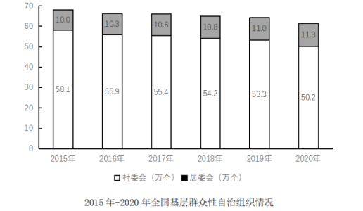 截止2020年底,全國(guó)基層群眾性自治組織共計(jì)61.5萬(wàn)個(gè),同比減少4.35%。其中,村委會(huì)50.2萬(wàn)個(gè),占基層群眾性自治組織的81.63%,村民小組376.1萬(wàn)個(gè),村委會(huì)成員207.3萬(wàn)人;居委會(huì)11.3萬(wàn)個(gè),占基層群眾性自治組織的18.37%,居民小組123.6萬(wàn)個(gè),居委會(huì)成員61.6萬(wàn)人。2016-2020年,我國(guó)村(居)委會(huì)完成選舉數(shù)分別為9.7萬(wàn)個(gè)、18.2萬(wàn)個(gè)、27.6萬(wàn)個(gè)、8.8萬(wàn)個(gè)、6.1萬(wàn)個(gè),其中,2020年村(居)委會(huì)登記選民數(shù)為1.1億人,參與投票人數(shù)為0.65億人。
