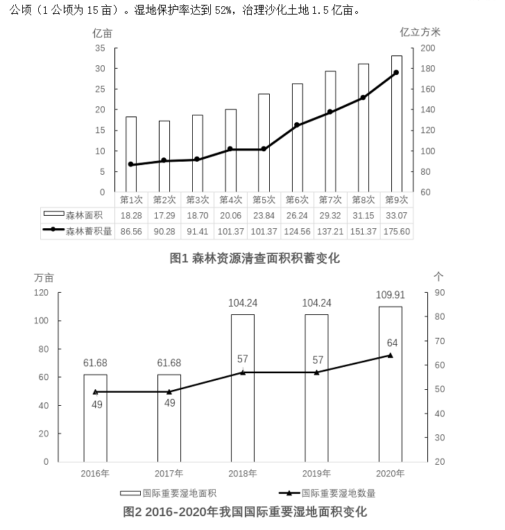 增加森林面積、提高森林質(zhì)量、提升生態(tài)系統(tǒng)碳匯增量,將為我國(guó)實(shí)現(xiàn)碳達(dá)峰、碳中和目標(biāo)、維護(hù)全球生態(tài)安全做出巨大貢獻(xiàn)。1973年,我國(guó)開(kāi)展了第一次森林資源清查。目前已完成第9次森林資源清查,我國(guó)森林面積和森林蓄積量連續(xù)30年保持“雙增長(zhǎng)”?!笆濉睍r(shí)期,我國(guó)累計(jì)造林5.45億畝,森林覆蓋率達(dá)到23.04%,森林蓄積量為175.6億立方米,森林面積達(dá)到2.2億公頃(1公頃為15畝)。濕地保護(hù)率達(dá)到52%,治理沙化土地1.5億畝。