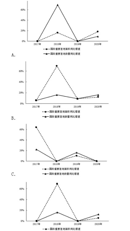 94.以下選項(xiàng)中,最準(zhǔn)確地反映了2017-2020年我國(guó)國(guó)際重要濕地面積、數(shù)量同步增速變化情況的是:( )
