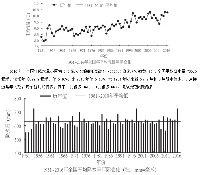 2016年,全國平均氣溫10.36℃,較常年平均氣溫偏高0.81℃,為1951年以來第三高,僅次于2015年(10.49℃)和2007年(10.45℃)。2016年四季氣溫均偏高,其中夏季氣溫為歷史最高;除1月偏低、11月接近常年同期外,其余各月均偏高,其中12月偏高2.6℃,為歷史同期最高。全國31個省(區(qū)、市)中,僅黑龍江平均氣溫較常年偏低0.2℃,其他省(區(qū)、市)氣溫均偏高,其中青海、甘肅、河南和貴州4省均為1951年以來的歷史最高。