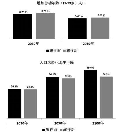 根據(jù)測算,全國城鄉(xiāng)普遍實施“單獨二胎”政策,將使總?cè)丝谠?030年達到14.53億,峰值人口增加1500萬;2050年,總?cè)丝谙陆禐?3.85億,但比現(xiàn)行生育率增加約5000萬人?!皢为毝ァ迸c現(xiàn)行生育政策相比,2030年老齡化水平從24.1%降低到23.8%;2050年從34.1%降到32.8%;直到2074年以后,該政策會影響老年人口數(shù)量。另外,城鄉(xiāng)普遍推行“單獨二胎”政策15年,勞動年齡人口規(guī)模開始增加,2030年15-59歲勞動年齡人口數(shù)量從8.75億升到8.77億;2050年從7.00億升至7.26億。